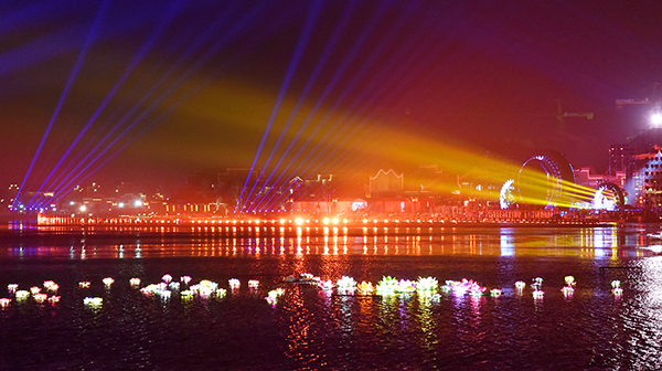 “中秋之夜”晚會(huì)以“天涯共此時(shí)”為主題,精心設(shè)置了主、副兩個(gè)舞臺。主舞臺以銅官窯古鎮(zhèn)水秀景觀為主體。波光粼粼的湖水、絢爛多彩的燈光、皎潔明亮的月色,恰到好處的倒影,共同營造出“水天一色,水月中秋”的詩情畫意。副舞臺設(shè)置在熱鬧的銅官美食街。街上有吹糖人、拉洋片、捏泥人等非物質(zhì)文化遺產(chǎn)項(xiàng)目以及舞火龍、手工月餅、花燈等中秋節(jié)傳統(tǒng)民俗,還原古人過中秋的情節(jié)。銅官窯古鎮(zhèn)優(yōu)美的意境、深厚的文化底蘊(yùn)與中秋佳節(jié)花好月圓人團(tuán)圓的氣氛完美融合,相得益彰。