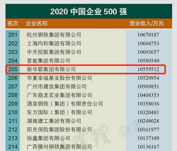 9月28日上午,中國企業聯合會、中國企業家協會在河南鄭州隆重發布2020中國企業500強排行榜。新華聯集團以年營業收入1055.95億元,連續16年躋身榜單,名列2020中國企業500強第205位。中國石油化工集團有限公司、國家電網有限公司、中國石油天然氣集團有限公司分別以年營業收入28117.9985億元、26521.9573億元、26192.0198億元名列榜單前3位。